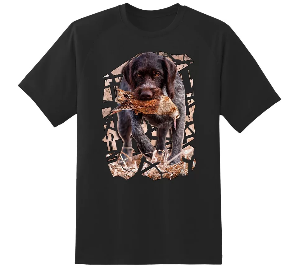 čierne tričko s drobitou nemeckou vizsla s bažantom