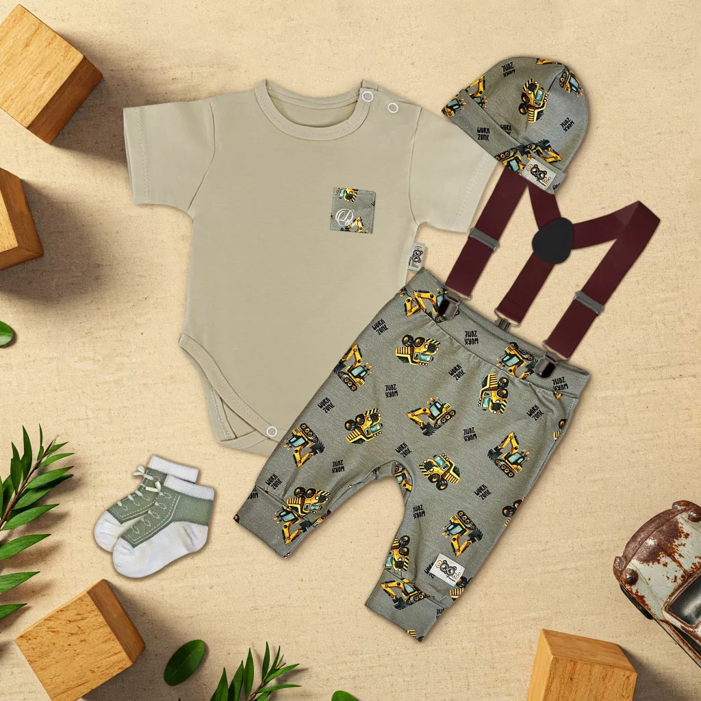 exkluzívna súprava detského oblečenia piesok/light s vreckami a vínovo červenými podväzkami
