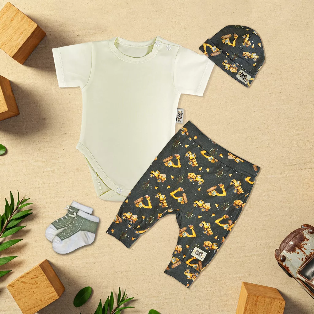 Detské nohavice: (tmavá farba so vzorom drapáka/kamiónu)