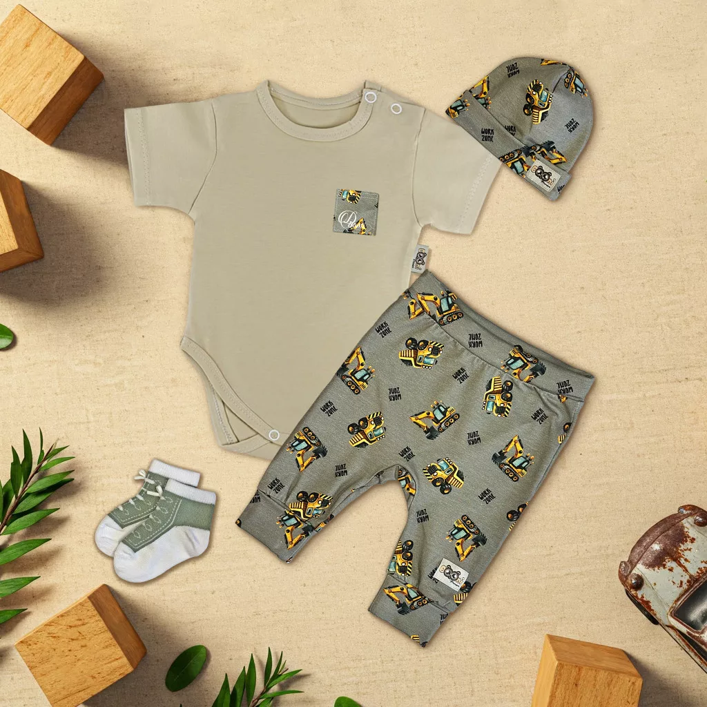 Detské nohavice: (Svetlé farby, so vzorom uchopovača/kamiónu.)