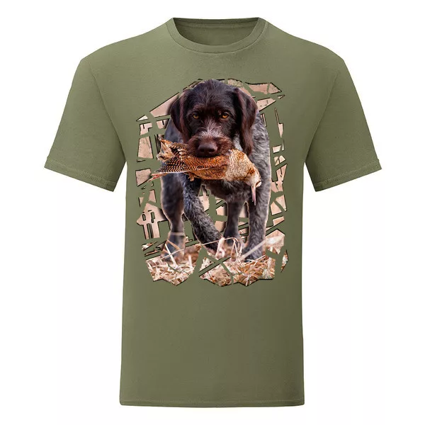 zelené tričko s drostovlásou nemeckou vizsla s bažantom