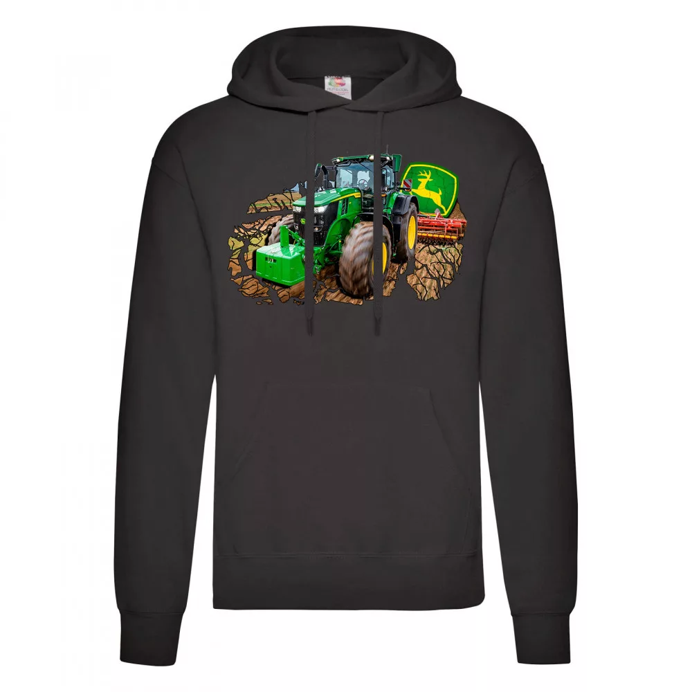 zelený traktor v práci s kapucňou čierna